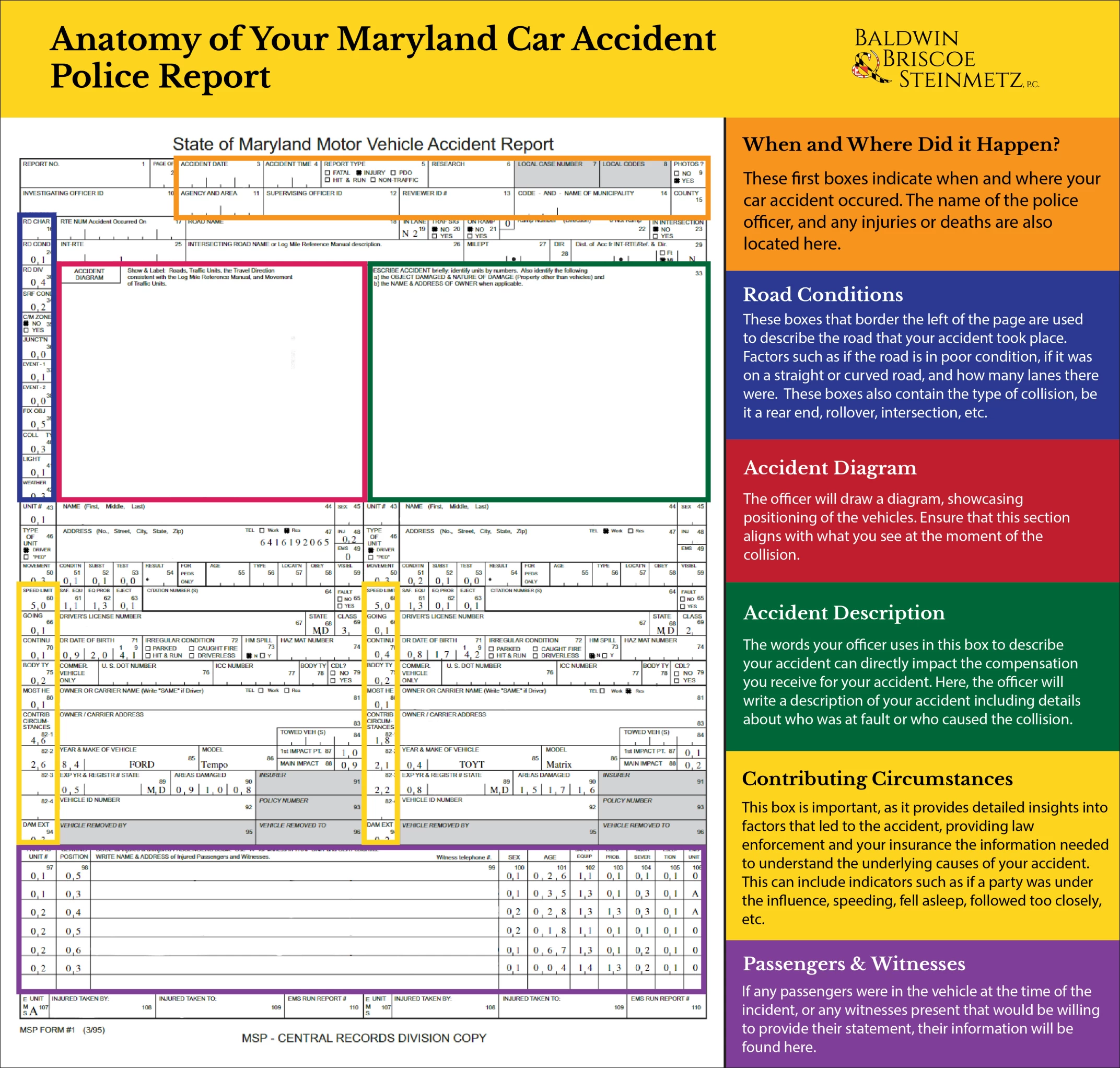 The police report contains crucial details like when and where the accident happened, who was hurt, and what property damage occurred. A full breakdown of what is included in your Maryland car accident police report is provided in the figure below.